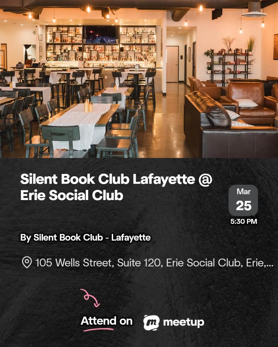 We'll be gathering on Wednesday, March 25, from 5:30-7:00 PM at Erie Social Club in Erie. The plan is simple: we'll kick things off by sharing what we're currently reading (no pressure, just good conversation!), then settle into 50 minutes of uninterrupted reading time. After that, feel free to stick around, chat, and connect with fellow book lovers! All formats are welcome: physical books, ereaders, ebooks, audiobooks, etc.