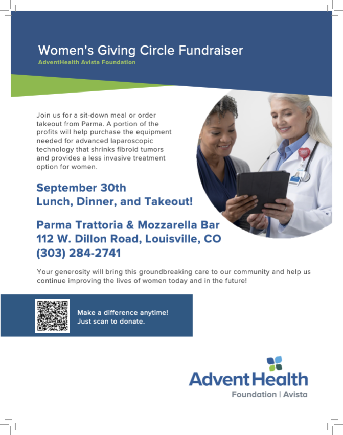 Advent Health Women's Giving Circle Fundraiser Back to Chamber News Advent Health Women's Giving Circle Fundraiser By Melanie Hassenfratz 9/3/2025 Images Images × Share × Email Facebook LinkedIn X Pinterest Powered By GrowthZone