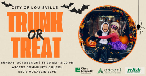 The City of Louisville will be hosting our first ever Trunk or Treat event in the parking lot in front of Ascent Community Church. We invite families to join us for this community trick or treat experience complete with spooky music and kid friendly activities!