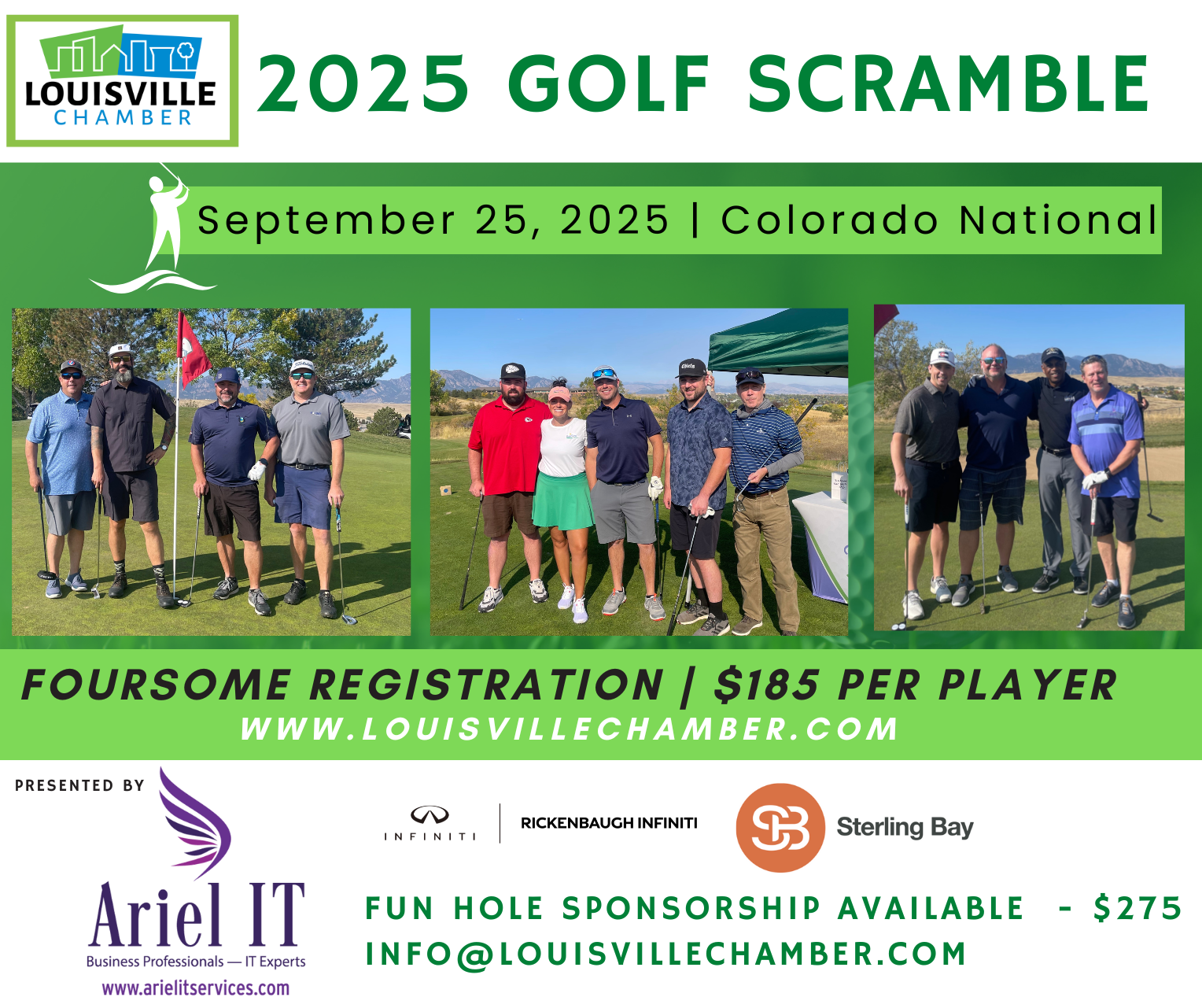 2025 GOLF SCRAMBLE INFO.When: September 25th, 2025 Where: Colorado National Golf Course! Presented by Ariel IT in 2024 and 2025 Pull together a foursome, sponsor a fun hole or just join in on the fun golf action. With prizes, raffle, and in game contests, it’s impossible to not have a blast! Seize the exciting opportunity to network at our prestigious annual golf tournament, hosted at the stunning Colorado National Golf Course! REGISTER HERE Fun Hole Sponsorship Available at $275 - Click HERE to sponsor. |