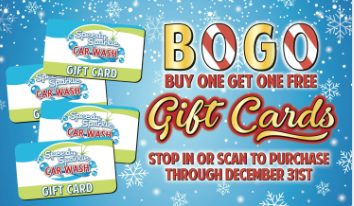 Tis the season for sparkling savings Buy One Get One FREE gift cards are available now through December 31st! Purchase a gift card (min. $10) either in store or online, and receive another card at equal value absolutely FREE Whether you're shopping for a white elephant party, your employees, or simply want a gift that saves you time & money, our gift cards are a surefire way to cross everyone off your list! Why wait?! Cash-in on holiday deals at Speedy Sparkle Car Wash today! |