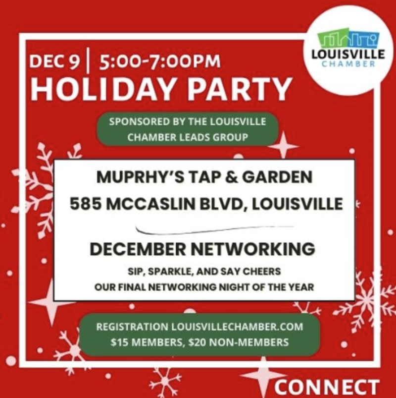 Louisville Chamber Holiday Party Sponsored by the Louisville Chamber Leads Group Tuesday, Dec. 9 | 5:00 – 7:00 p.m. Murphy’s Tap & Garden, 585 McCaslin Blvd, Louisville
