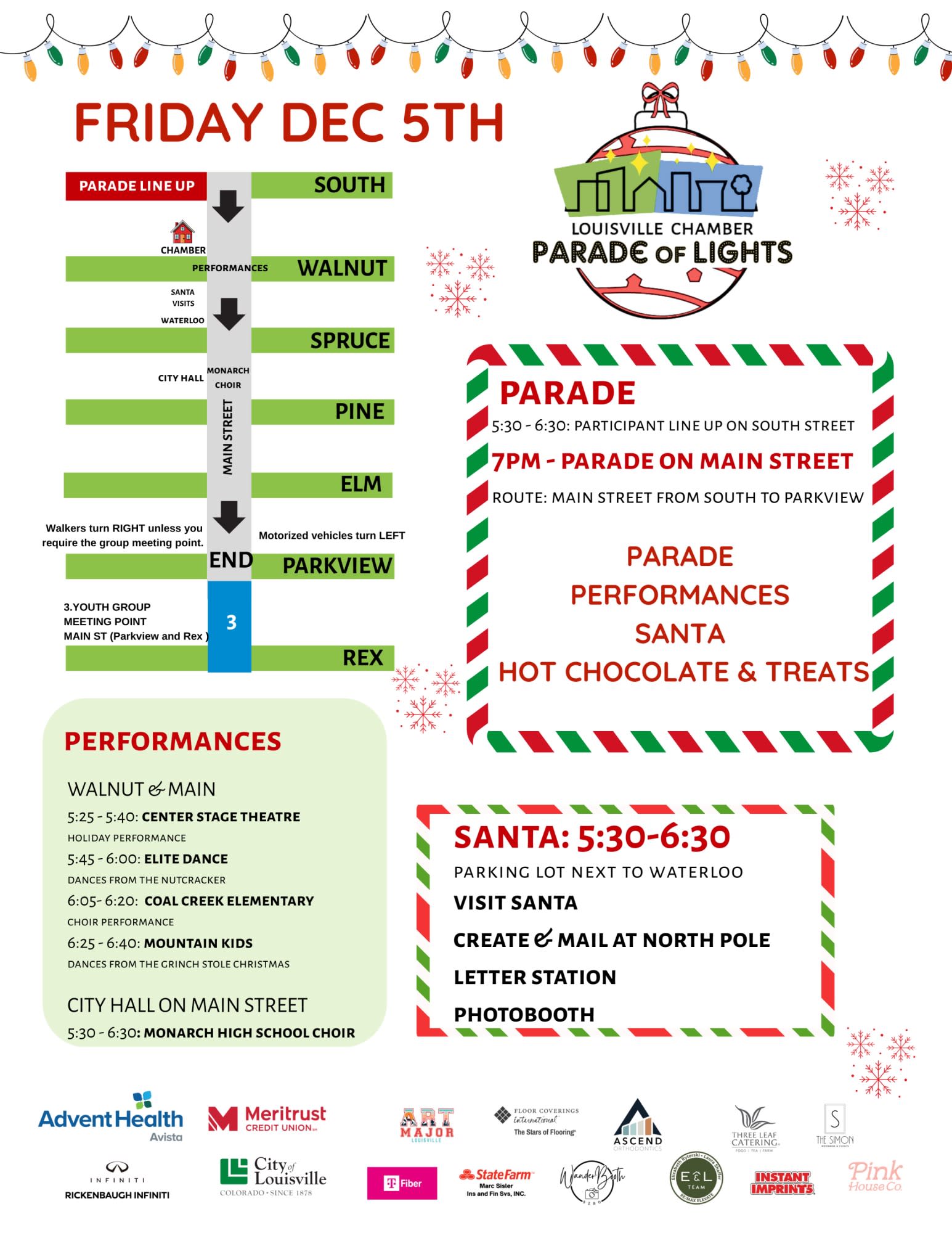 PARADE OF LIGHTS Friday, Dec 5, 2025 | 5:30–9:00 PM A special thank you to our Platinum presenting sponsors: Advent Health City of Louisville Meritrust Credit Union Rickenbaugh Infiniti Celebrating our Parade partners: Gold: Art Major, Wanderbooth 5280, Ascend Orthodontics, T-Fiber, E&L Team, Floor Coverings, Marc Sisler State Farm Silver: Three Leaf Catering, Instant Imprints, The Pink House, The Simon |