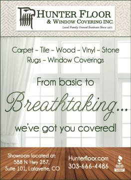 Hunter Floor & Window Covering (A+ BBB | 54+ years)"Hunter Floor & Window Covering is your locally, family-owned source for all of your flooring and Hunter Douglas window covering needs. We have been in business for over 54 years and maintain an A+ rating with the BBB. Our showroom has all the latest styles, colors and designs to choose from. Please call or stop by to schedule a free estimate. We also offer no interest financing with approved credit." Kiffaney Wheaton Hunter Floor & Window Covering, Inc. 588 N. Hwy. 287 Ste 101 Lafayette, CO 80026 Office: 303.666.4486 x 1 Mobile: 303.877.0757 www.hunterfloor.com |