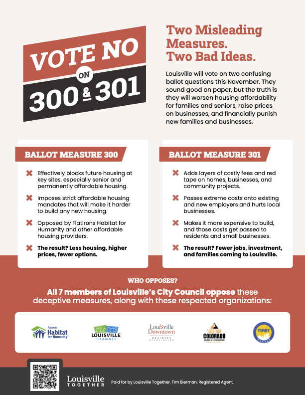 Louisville Together is a broad coalition opposing Ballot Measures 300 and 301, including all seven City Council members, former mayors, affordable housing advocates, and business leaders. Along with the Downtown Business Association, Flatirons Habitat for Humanity, and Together Colorado, the Louisville Chamber endorses NO on 300/301. Please see the Voting Guide below.