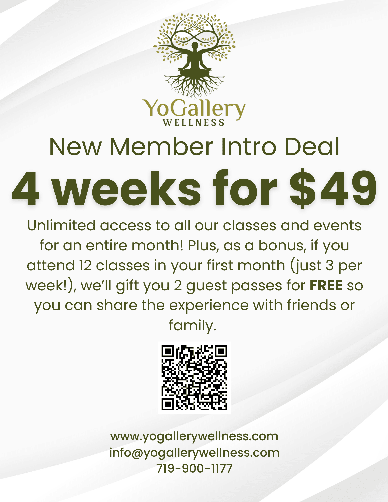 Unlimited access to all our classes and events for an entire month! Plus, as a bonus, if you attend 12 classes in your first month (just 3 per week!), we’ll gift you 2 guest passes for FREE so you can share the experience with friends or family.